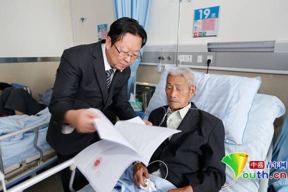 2016年9月29日,邱少云名誉权案代理律师向病床上的邱少华老人传达判决书内容。那一天,老人特意嘱咐家人为其换上了正装。中国青年网记者 张炎良 摄