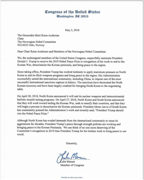 这封信最后还对特朗普进行了“十分拔高”的评价:“特朗普总统的强硬政策管用了,还给朝鲜半岛带来了和平。我们认为没有人比特朗普总统更值得获得诺贝尔委员会的认可。因为他不遗余力地为世界带来和平。”