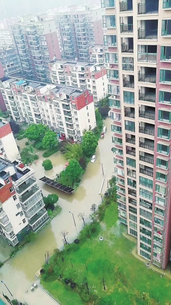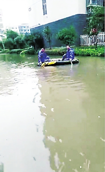 在另一段视频中,某小区内,两名男子正坐在一艘橡皮艇上出行,记者注意到,积水水面快达到路边冬青树的顶端。有网友调侃称:某小区阳光海景房,数量不多了解一下。