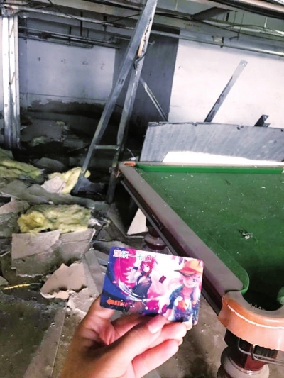 接到业主们的投诉后,记者来到现场,看到业主们所说的建筑废墟位于1号楼与5号楼之间负一层的地下车库处,估测原占地面积有500平方米。由于已经断电,正午时分此处仍显得漆黑肮脏,能闻到一股臊臭味儿。残垣断壁内,能看到有两张台球桌,地面上随处堆放着建筑垃圾,还散落有多张印有“娱乐一卡通”的储币卡。