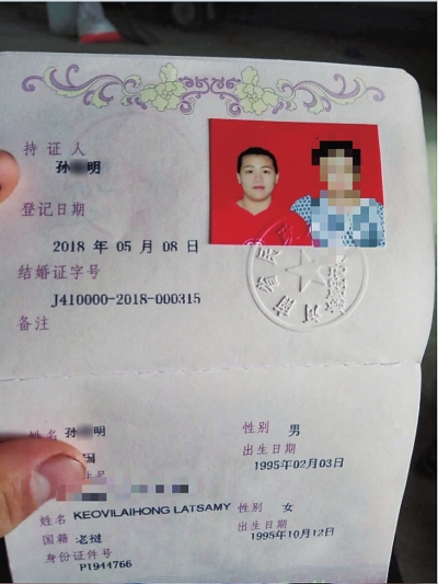 男女双方在中国办理的结婚证(合影中左为老挝新娘)