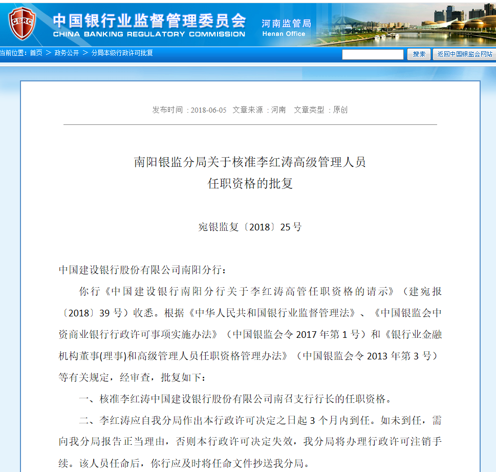 核准李红涛中国建设银行股份有限公司南召支行行长的任职资格。