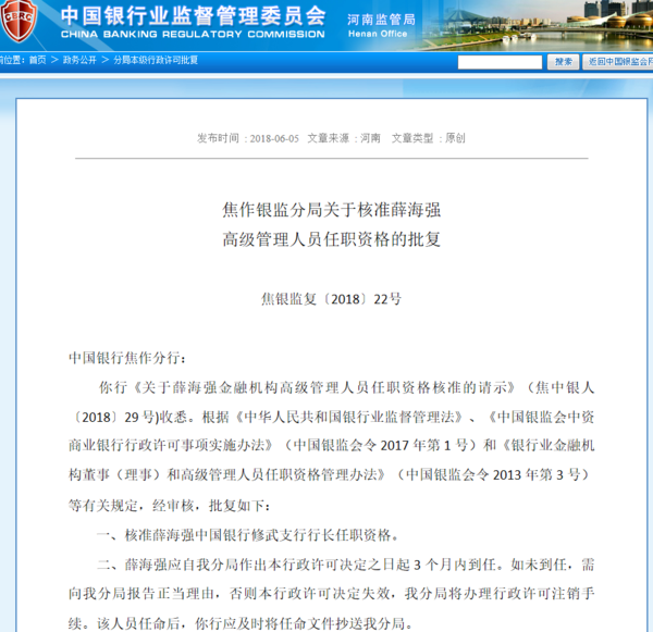 核准薛海强中国银行修武支行行长任职资格。