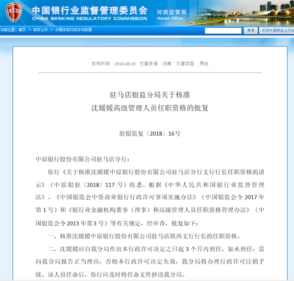 核准沈媛媛中原银行股份有限公司驻马店铁西支行行长的任职资格。