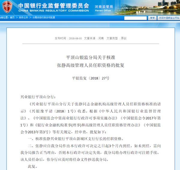 核准张静兴业银行平顶山新城区支行行长的任职资格。