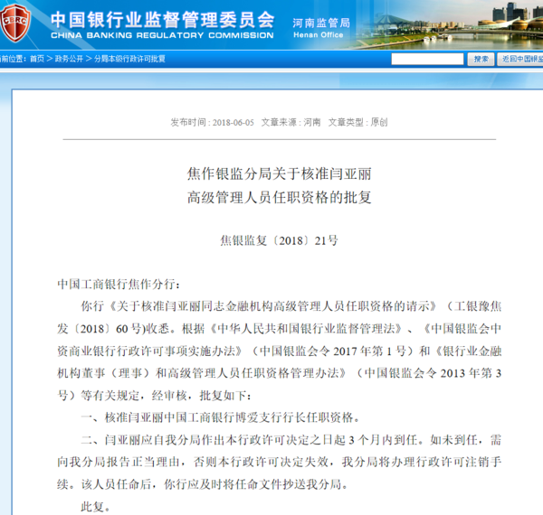 核准闫亚丽中国工商银行博爱支行行长任职资格。