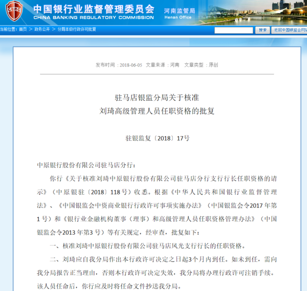 核准刘琦中原银行股份有限公司驻马店风光支行行长的任职资格。