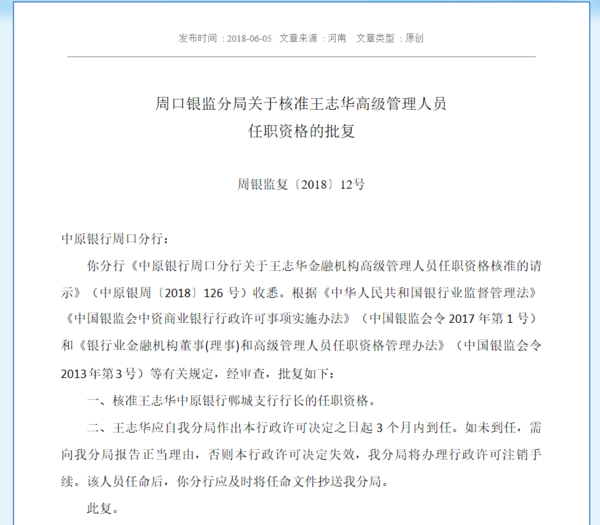 核准王志华中原银行郸城支行行长的任职资格。