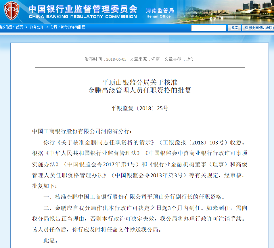 核准金鹏中国工商银行股份有限公司平顶山分行副行长的任职资格。