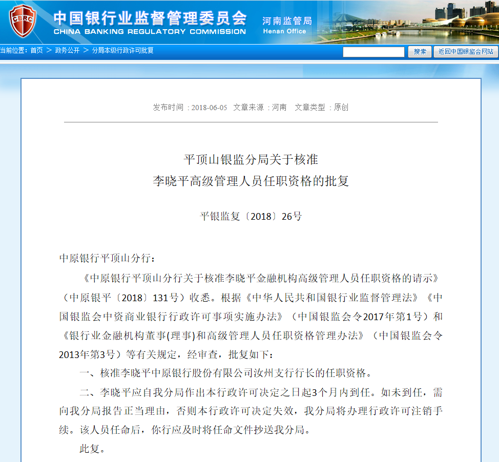 核准李晓平中原银行股份有限公司汝州支行行长的任职资格。