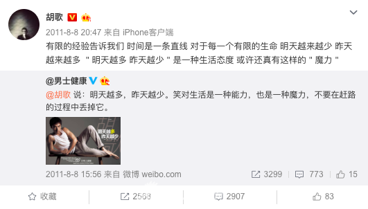 2011年8月,胡歌写道“对于每一个有限的生命,明天越来越少,昨天越来越多……”,对应2012年福建高考作文“人生中的赛跑”。