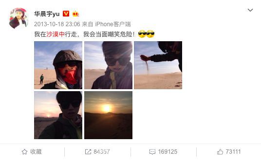 华晨宇的微博多次命中全国各地作文题,例如他发微博“我在沙漠中行走,我会当面嘲笑危险”,与2014年高考语文上海卷作文题“穿越沙漠和自由”完全吻合。