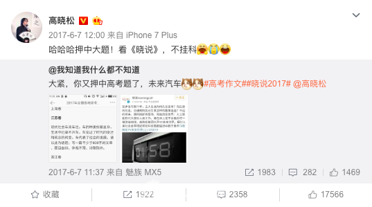 高晓松曾意外压中2017江苏省高考语文作文题。《晓说》曾专门畅想人类未来社会的科技发展,真所谓“看晓说,不挂科”。