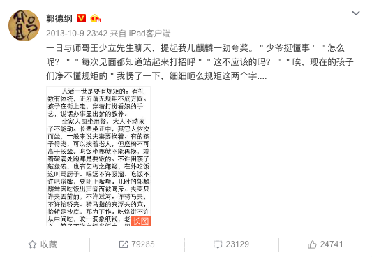 郭德纲2013年微博“撞衫”北京卷。2013年10月,相声演员郭德纲发布长微博,教育儿子人活一世要有规矩。2014年北京大作文题目是“老规矩”。