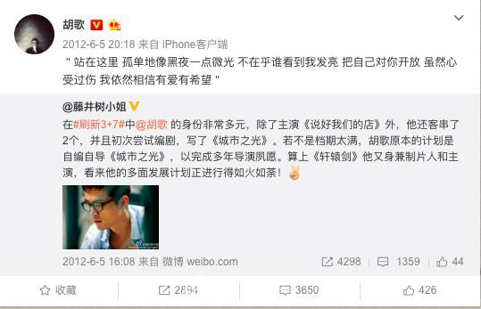 2012年,上海高考作文背景材料为“人们对自己心灵中闪过的微光,往往会将它舍弃,只因为这是自己的东西。而从天才的作品中,人们却认出了曾被自己舍弃的微光”。然而就在高考前夜,胡歌发布的微博关键词就是“微光”。