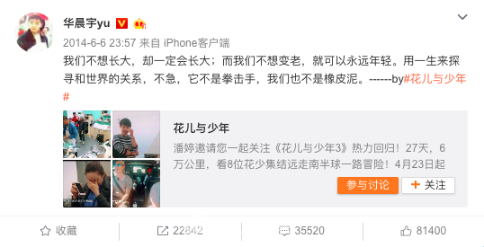 2014年高考前夜,华晨宇在微博感慨青春:“我们不想长大,却一定会长大;而我们不想变老,就可以永远年轻。”又与当年江苏卷“青春不朽”神吻合。
