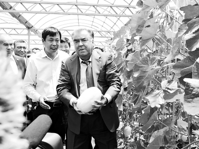 拉赫蒙总统摘了一个甜瓜,要带回国。