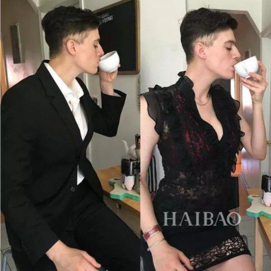 平时Rain Dove都是将自己的胸部裹起来的,Rain Dove也总在Ins上放一些自己男女装的对比图,推翻大家对自己刻板印象。