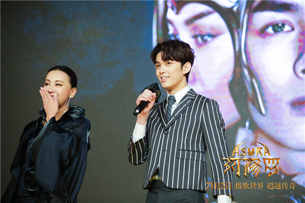 发布会开始,两场奇幻服装走秀吸引了现场所有人的目光,阿修罗军与叛军的对抗演绎更是引发了现场掌声欢呼不断。吴磊、刘嘉玲在第一场秀之后,携手走上舞台,两人大谈拍摄背后的故事,由于梁家辉临时有事而未能参与发布会,吴磊现场调侃:“他可能是抛下我们自己去打天了吧。”在谈及角色时,刘嘉玲更是笑称梁家辉为“魔鬼”,吴磊为“天使”,直言三头合体后的阿修罗王就是魔鬼与天使的组合。吴磊也在现场“大吐苦水”:“与家辉哥、嘉玲姐两位老戏骨对戏,我压力很大,在表演方面,不仅要配合家辉哥的动作,还要演自己的角色,挑战很大。”