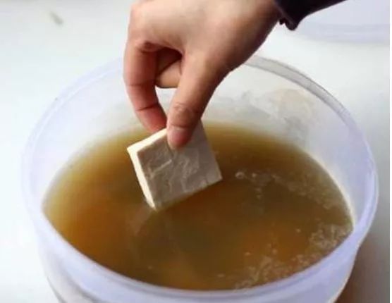 一看:臭豆腐的水是否黑得像墨水一样,如果有小颗粒的沉淀、或颜色为红褐色并有沉淀造成分层说明臭豆腐是不正常的。餐盘上的臭豆腐如果黑的像墨汁一样的,也是“问题豆腐”。
