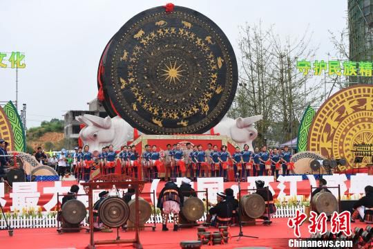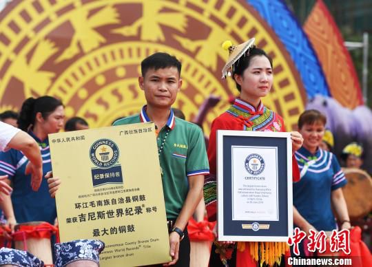 当天,世界最大铜鼓(中国·环江)祭祀盛典暨吉尼斯纪录授匾仪式在环江县举行。在当地铸造的鼓面直径6.68米、鼓身厚度2.88米、重50吨的巨型铜鼓成功刷新吉尼斯世界纪录。