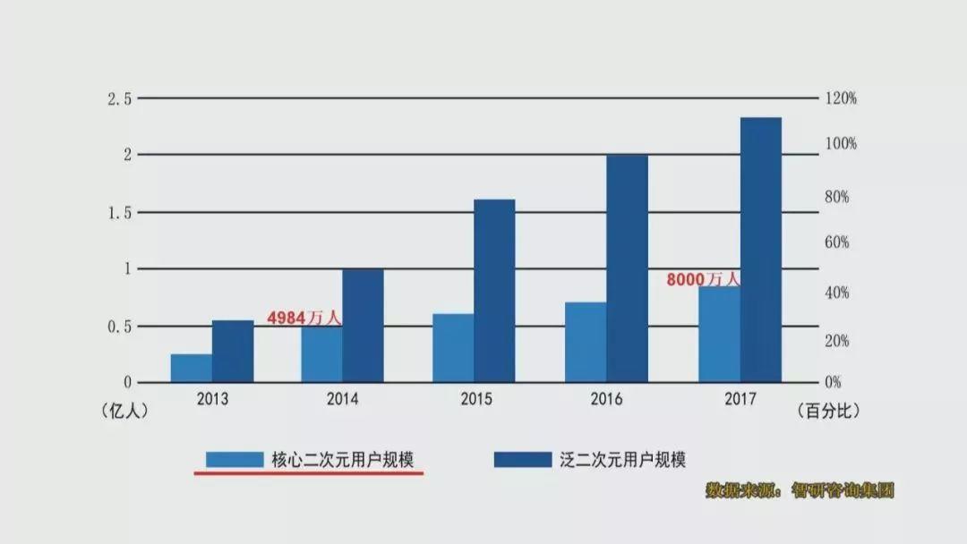 来自国内一家大型行业研究咨询机构的数据显示,在中国,“二次元”核心用户已从 2014 年的 4984 万人上升至2017 年的 8000 万人;在2016 年,“二次元”相关产品的市场规模就已经超过 1000 亿元,预计未来这个数字将迅速成倍数增长。