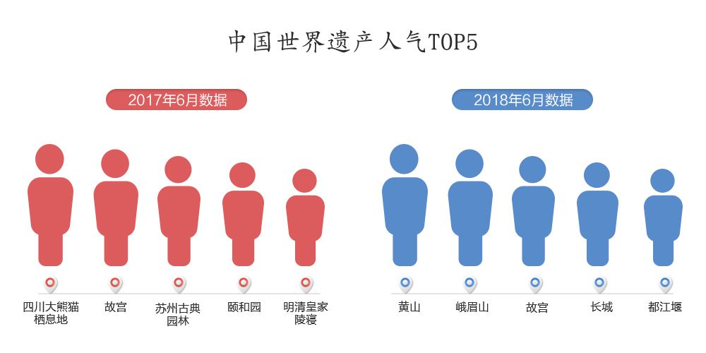 2017年6月,我国首个“文化和自然遗产日”之际,国内某旅游网结合平台数据发布《中国世界遗产人气榜》:四川大熊猫栖息地、故宫、苏州古典园林、颐和园、明清皇家陵寝成为人气最高的中国世界遗产景区前5名。