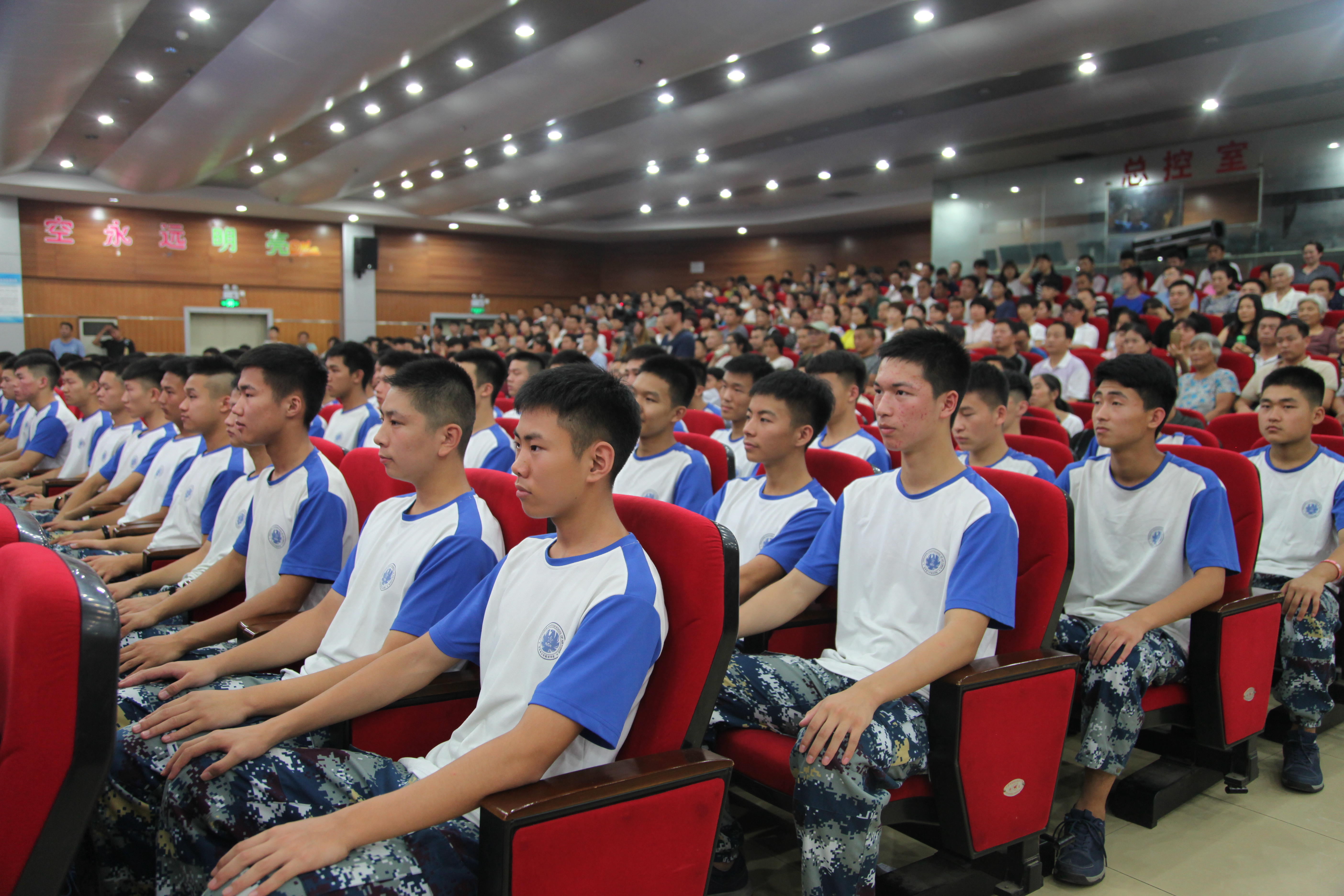 立正、向右看齐、向前看、稍息,伴随着一系列的指令发出,7月14日16时许,河南省实验中学大礼堂,2015级,2016级,2017级,以及刚被选拔进来的2018级航空班学生身穿空军迷彩裤、脚蹬空军作战靴,个个目不斜视看向前方,腰杆挺得笔直,除了脸上的稚嫩,在他们身上已经有了军人的影子。