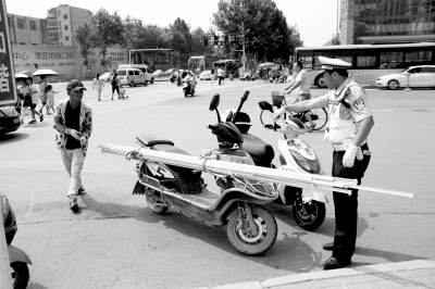 随后,一名男子骑电动车驶向路口。因其车上拉了一捆长约6米的塑钢长杆,严重超过了电动车本身的长度数米,被交警拦下进行处罚。