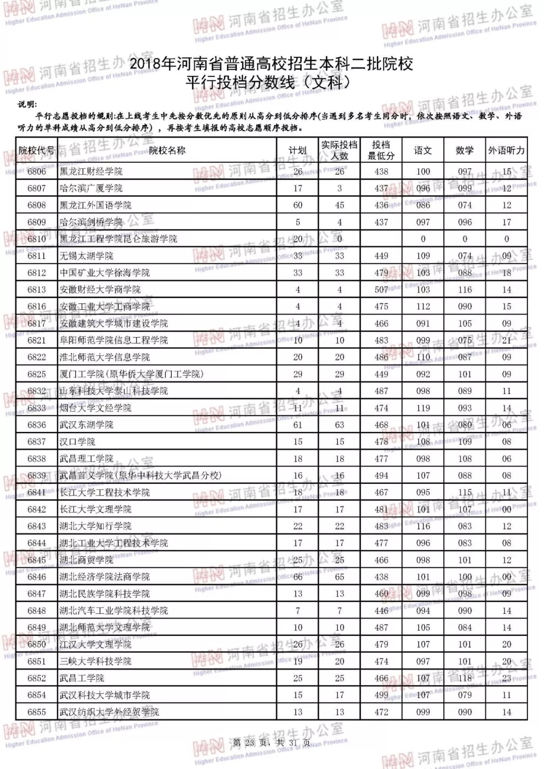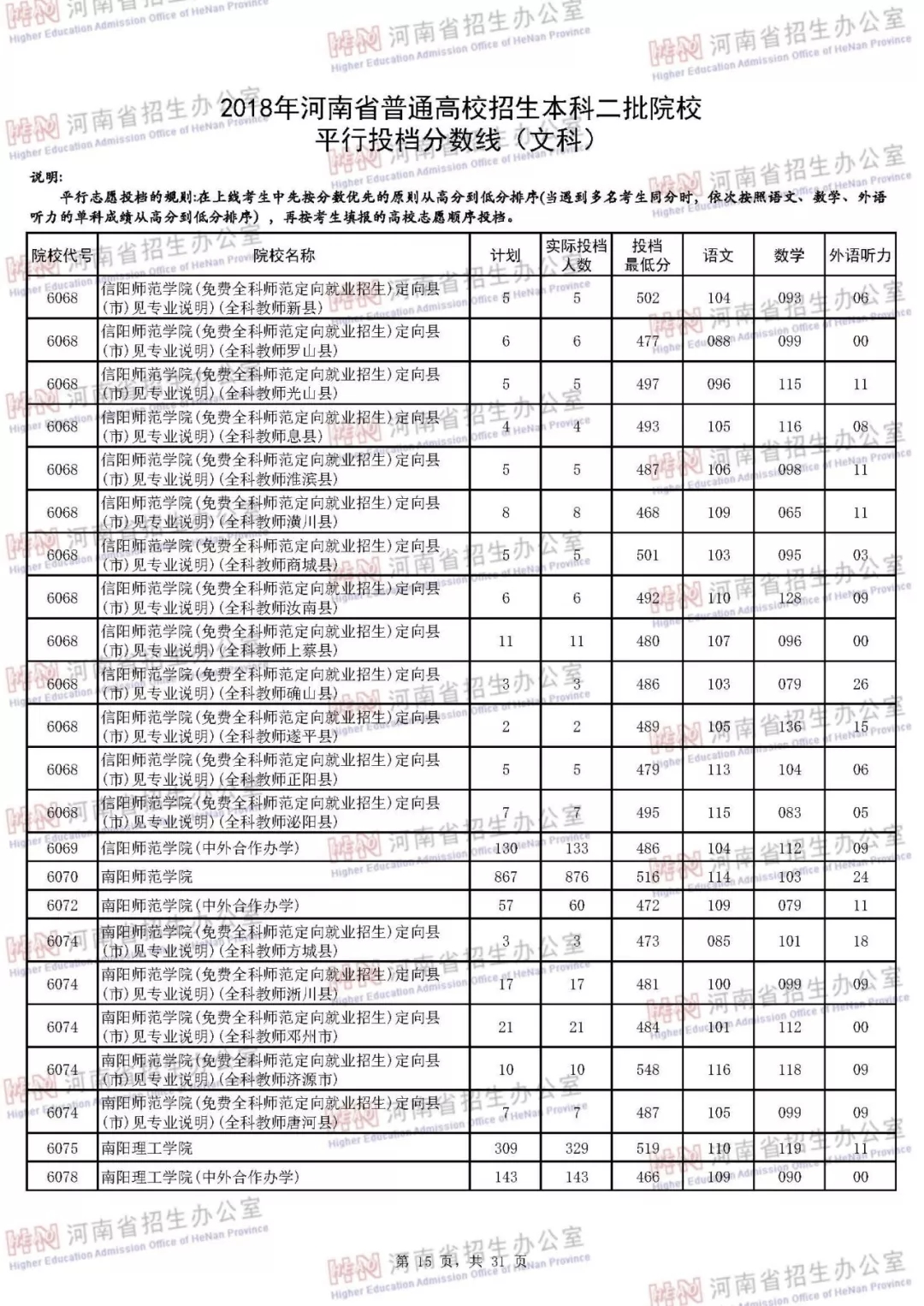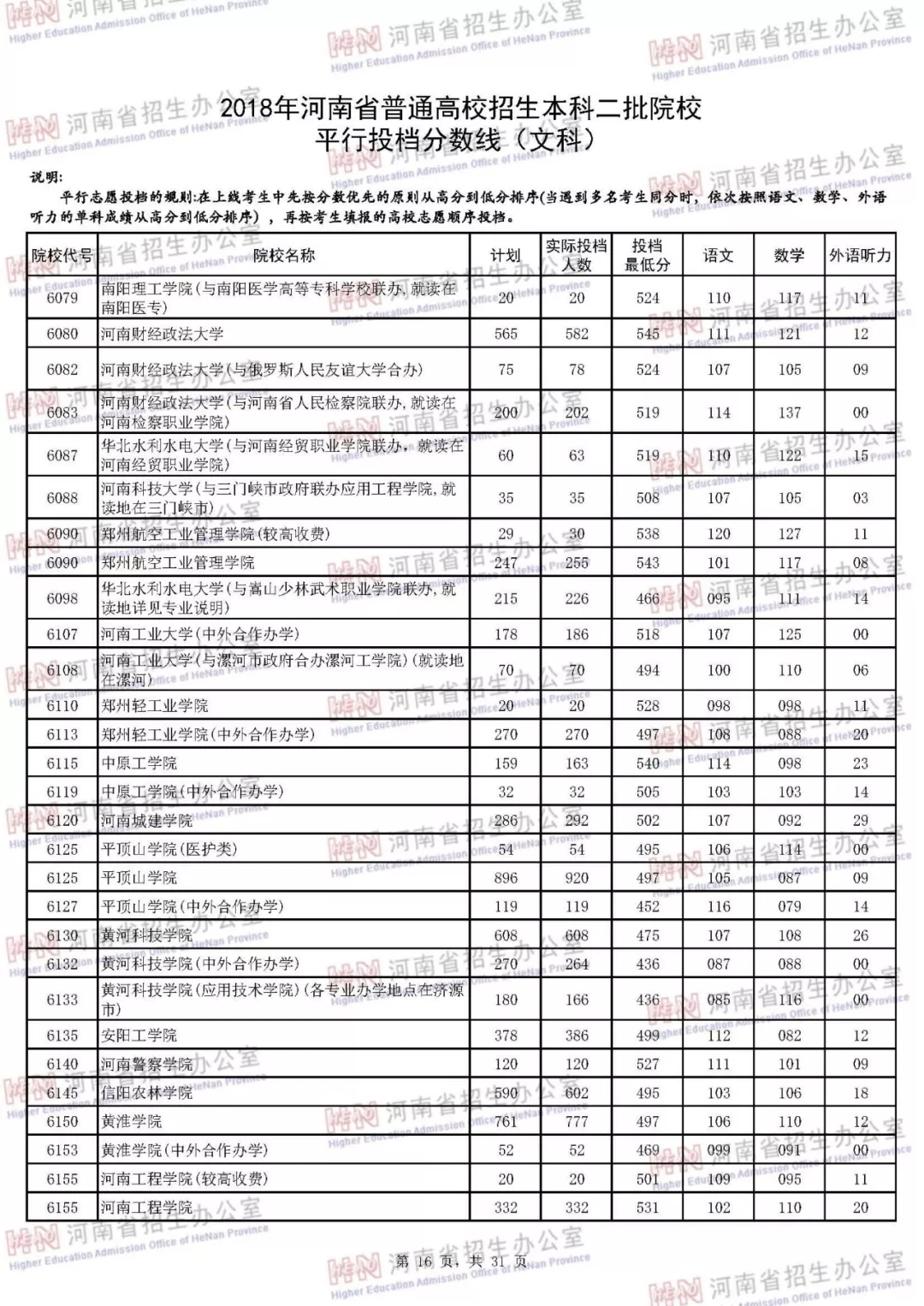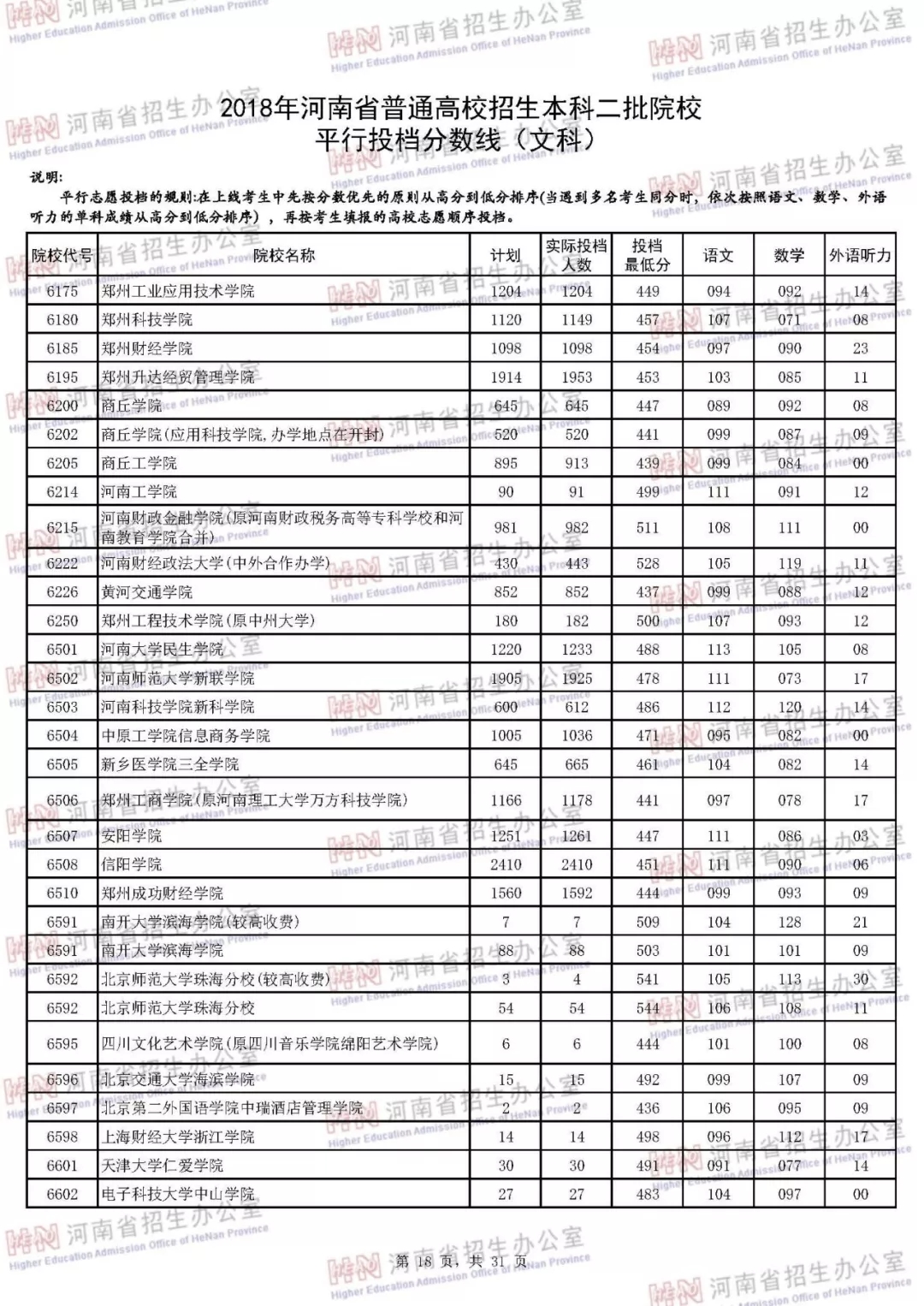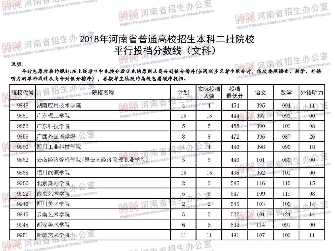 附:2018年河南省普通高校招生本科二批院校平行投档分数线