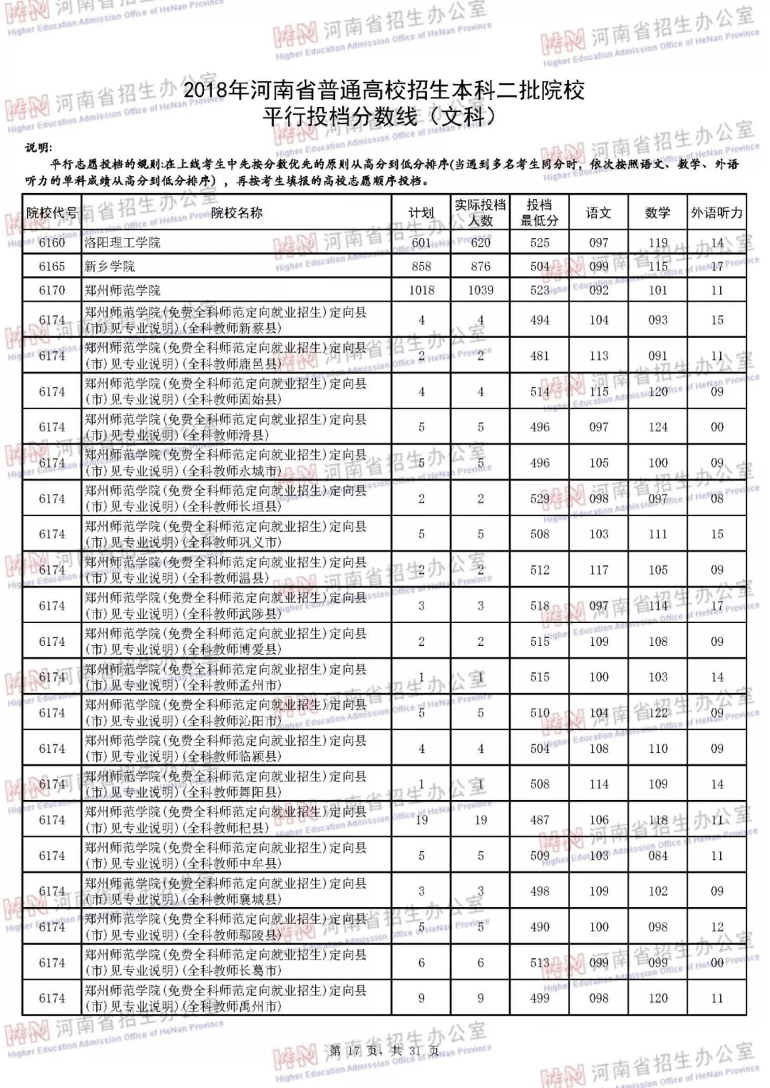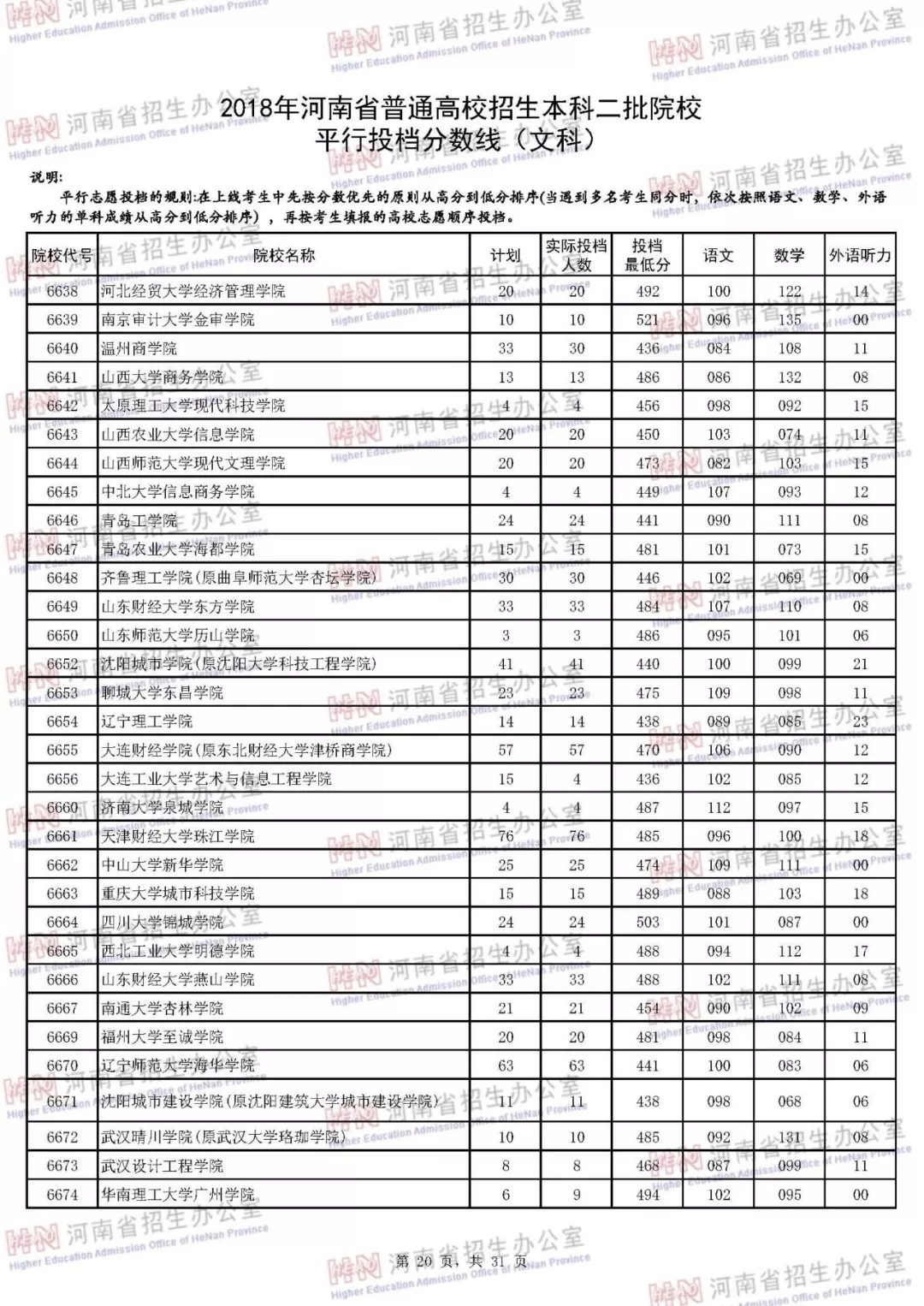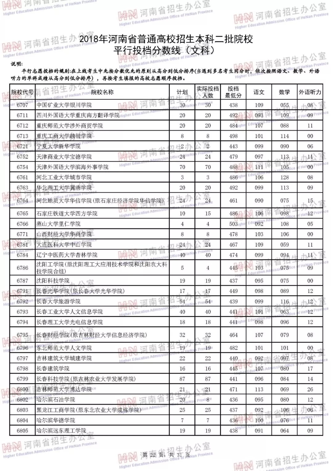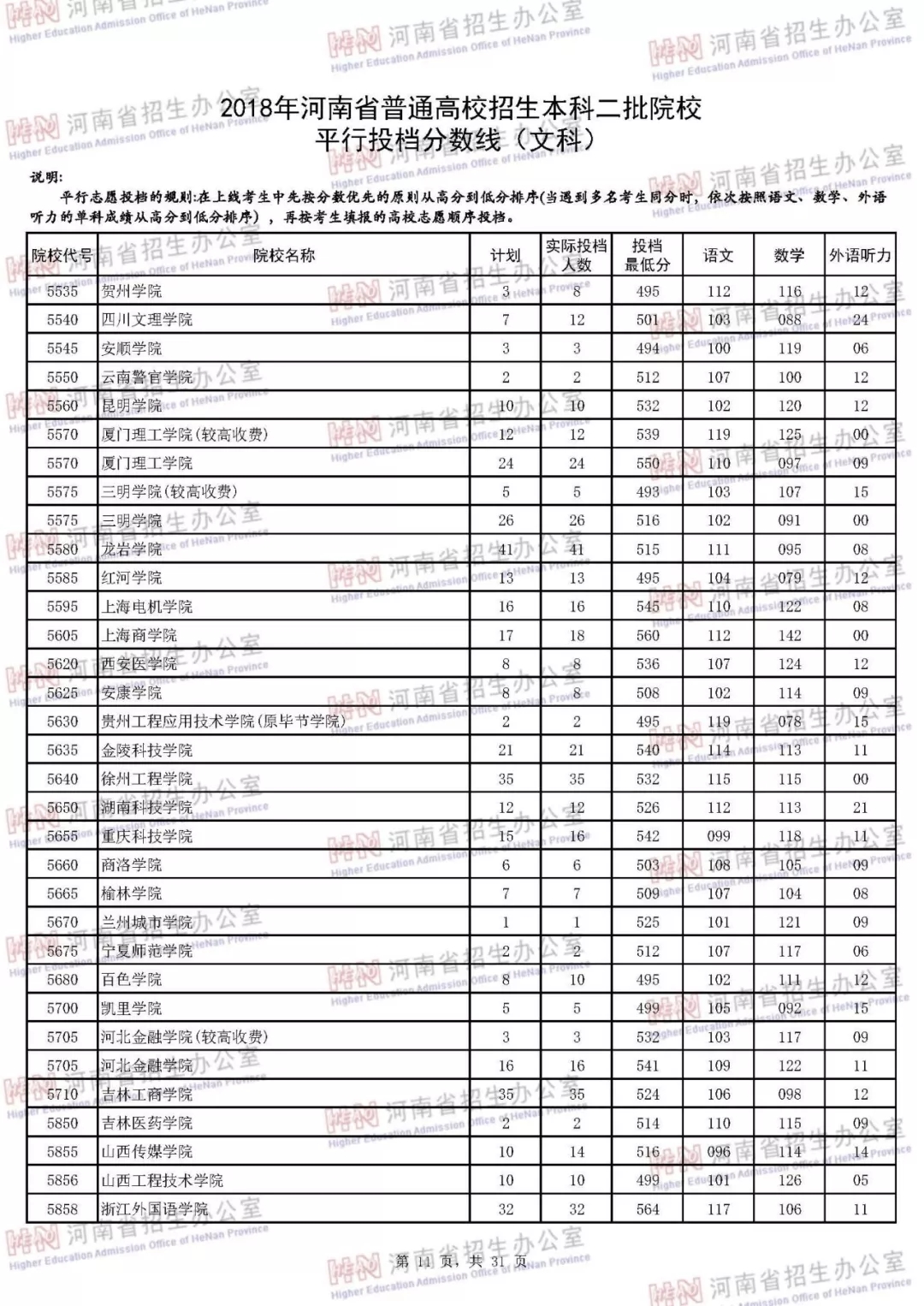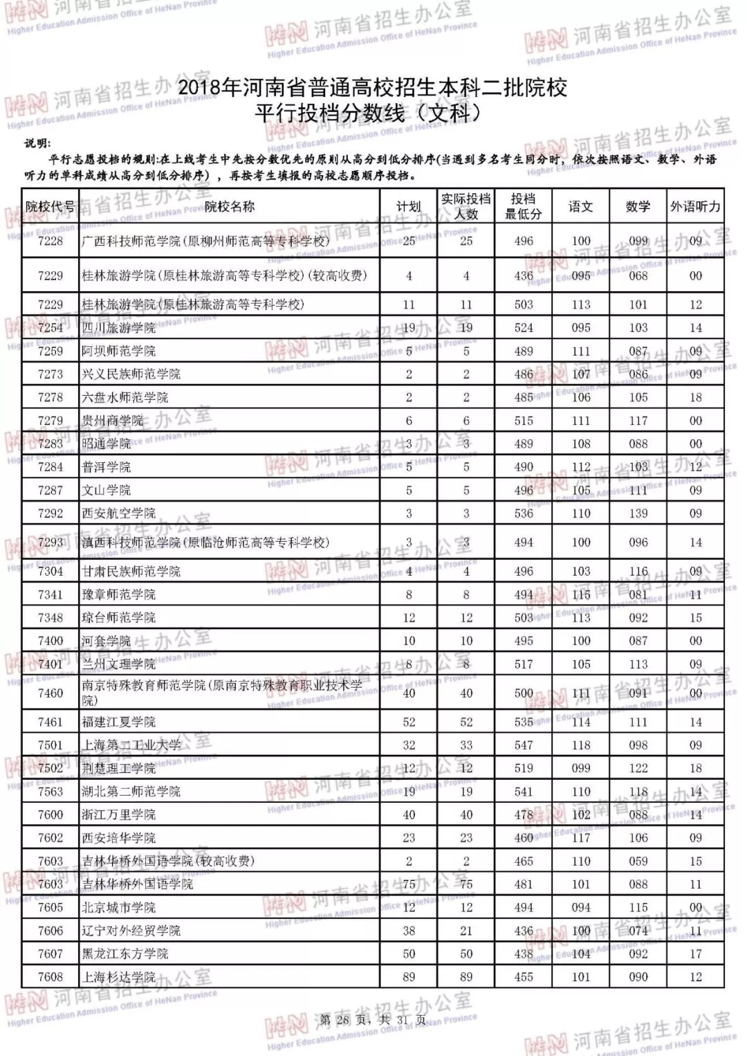 附:2018年河南省普通高校招生本科二批院校平行投档分数线