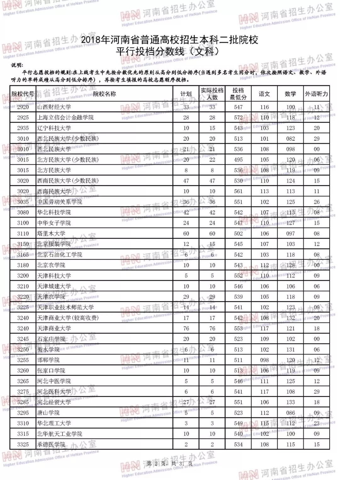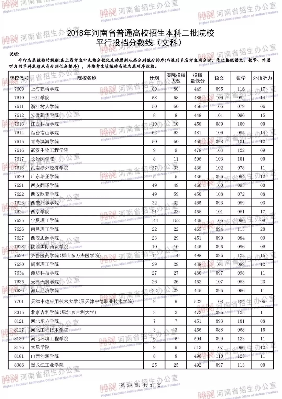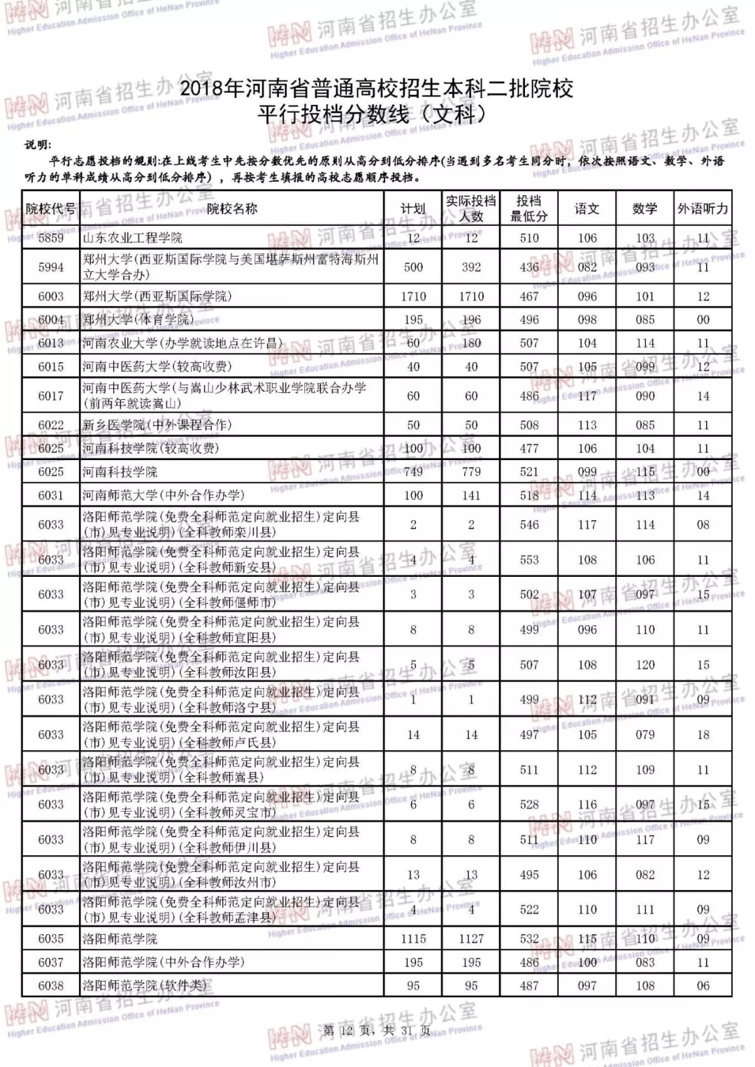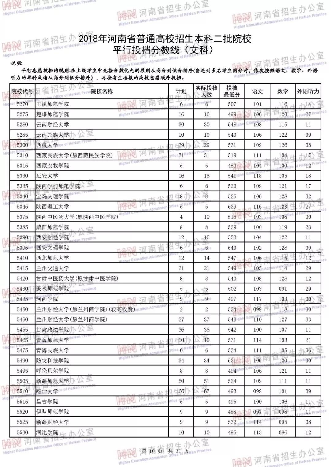 附:2018年河南省普通高校招生本科二批院校平行投档分数线