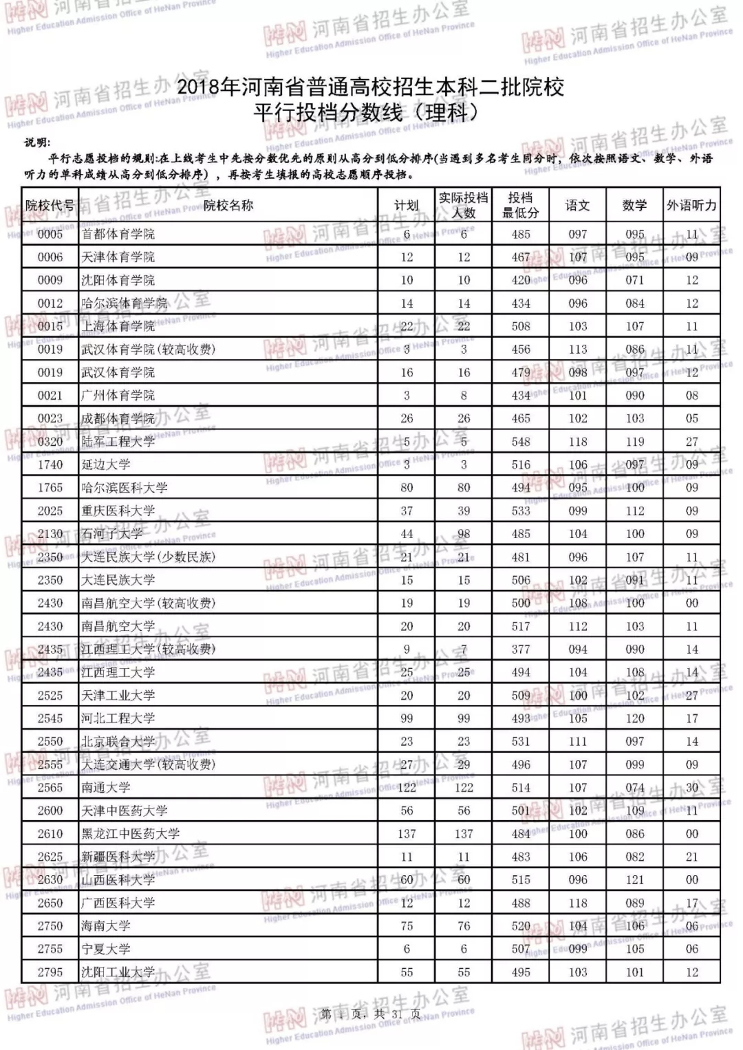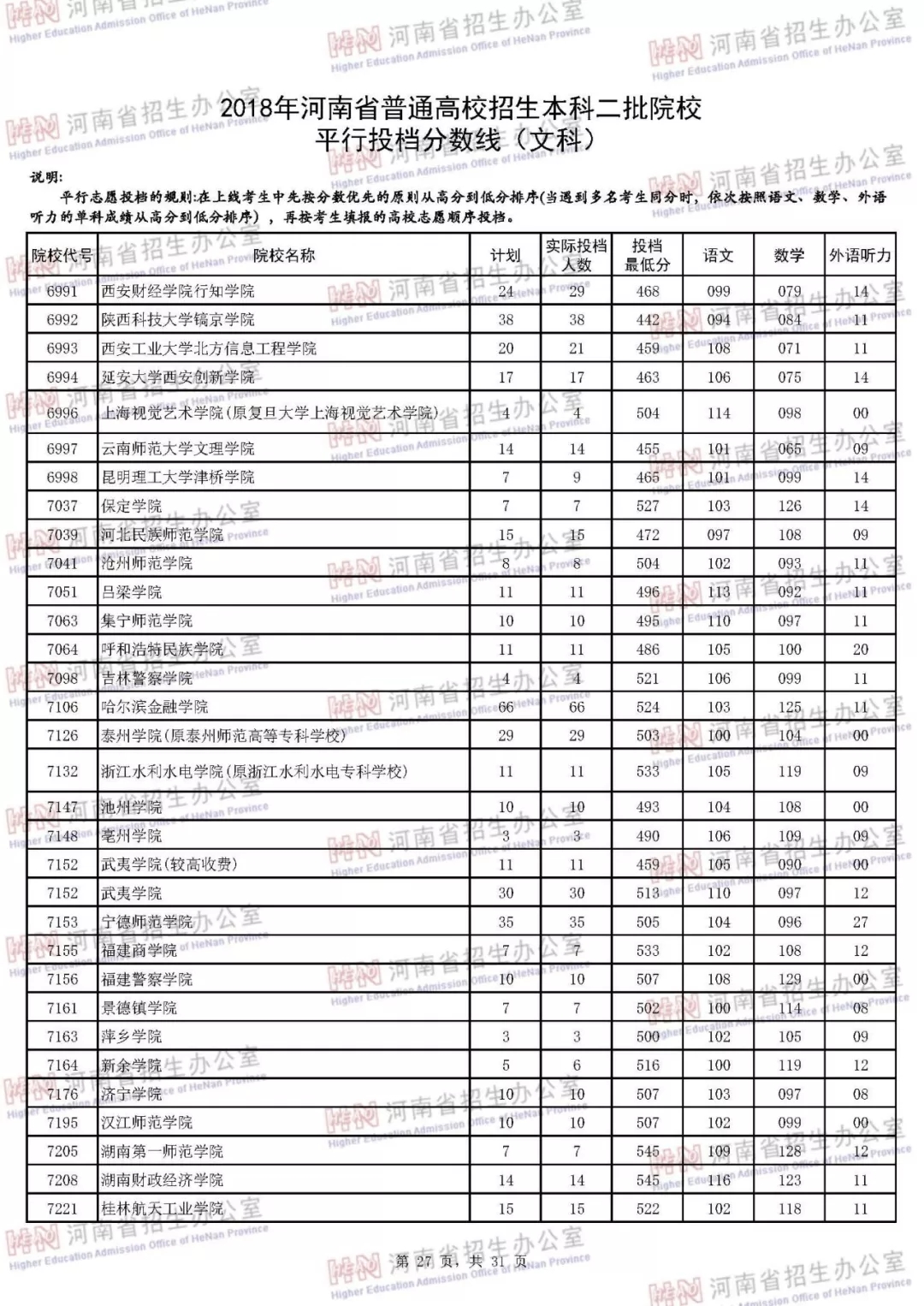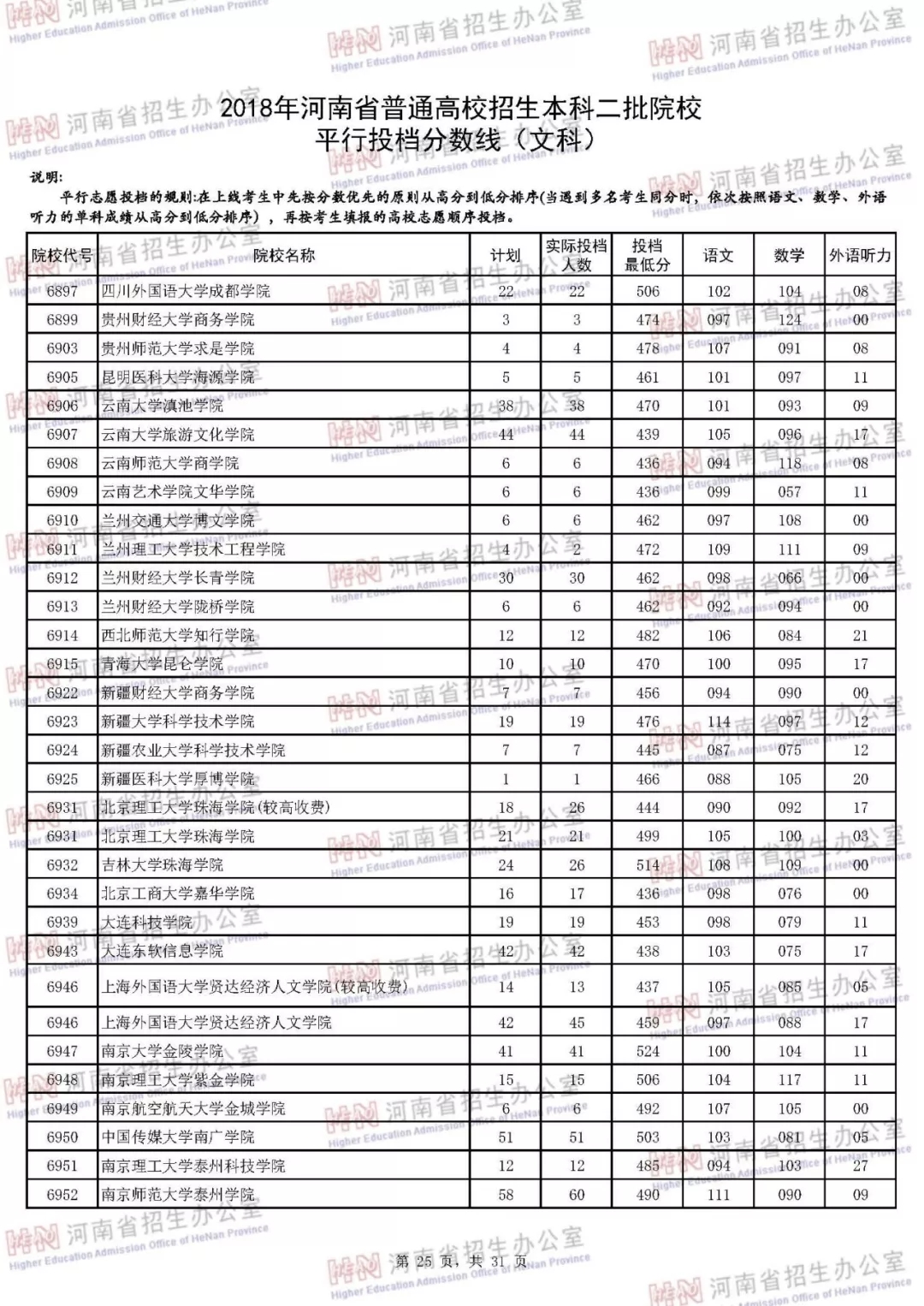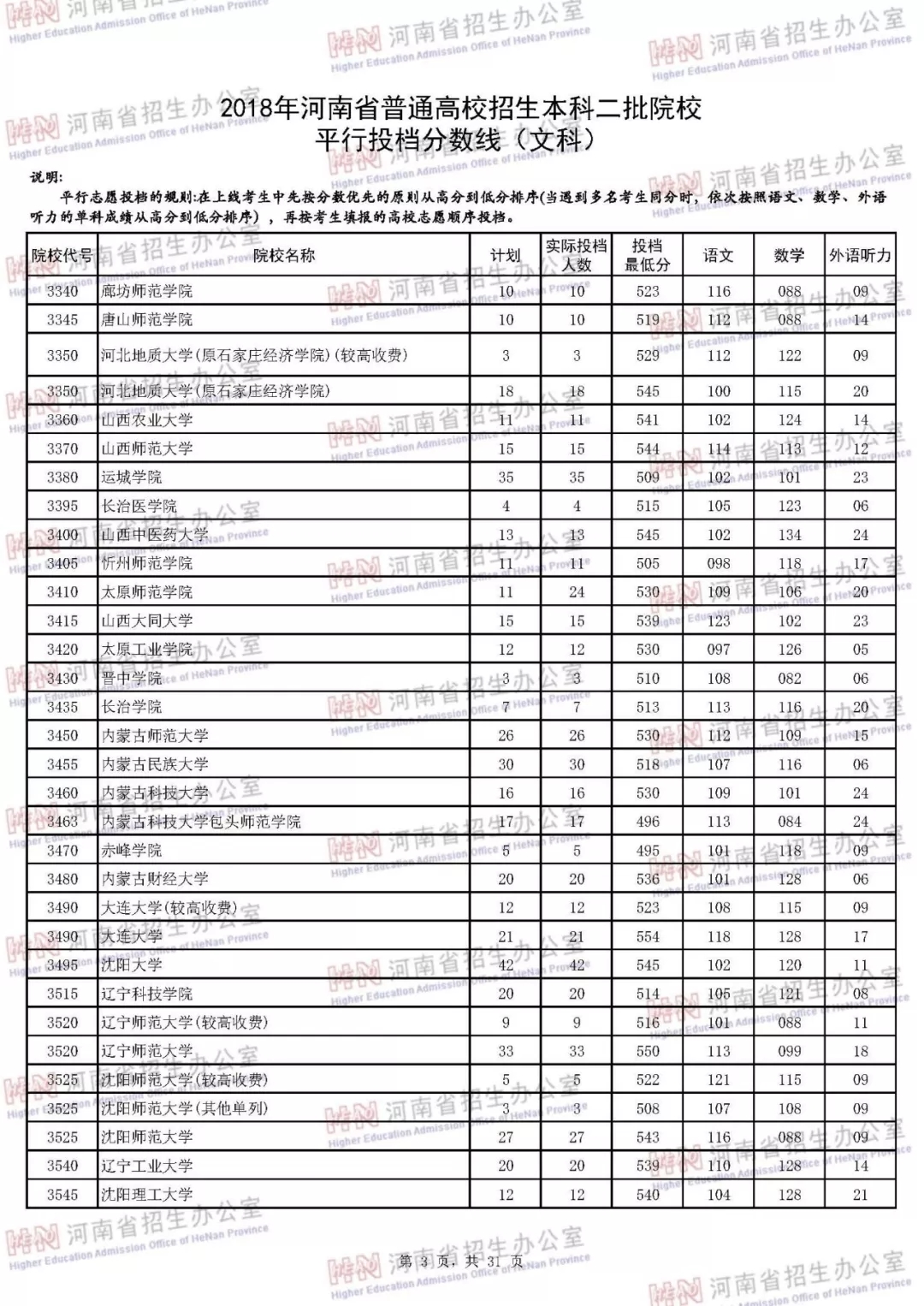 附:2018年河南省普通高校招生本科二批院校平行投档分数线
