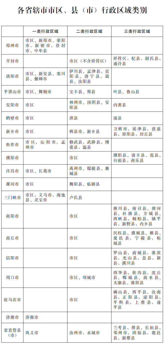 其中,郑州市区及新郑市、荥阳市、新密市、登封市、中牟县均被列为"一类行政区域"。同样为"一类行政区域"的,还有洛阳市区、新安县、栾川县、偃师市;平顶山市区、舞钢市;安阳市市区;鹤壁市市区;新乡市市区;焦作市市区、沁阳市、孟州市;许昌市市区、长葛市;漯河市市区;三门峡市市区、义马市、渑池县、灵宝市;济源市;巩义市。