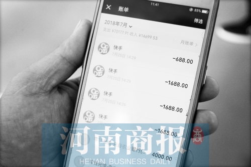 刘女士儿子打赏主播充值记录,最多一天刷了3个“1688元”河南商报记者 王访贤/摄