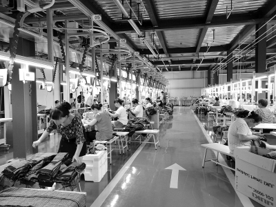 在迪尚华盈A厂裁剪车间里,映入眼帘的是两组自动化服装生产线。德国进口的缝纫机、锁边机纵向排开,工人按动电钮,领口、前襟、袖子完美“牵手”,一件件“千鸟格”风衣在流水线上制作成功,记者注意到,风衣商标印着“GAP”。