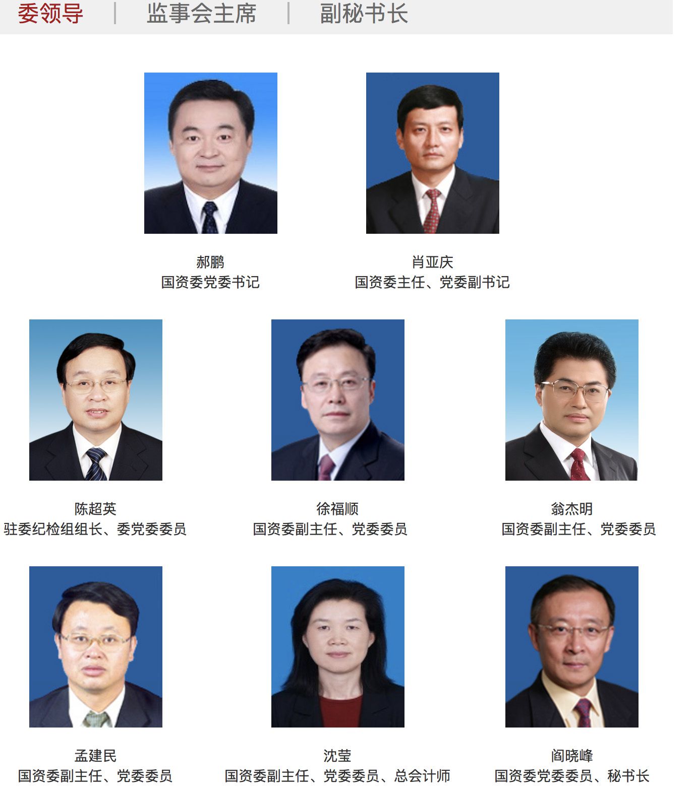 目前,国务院国资委官网“委领导”班子成员包括:党委书记郝鹏,主任、党委副书记肖亚庆,驻委纪检组组长、委党委委员陈超英,副主任、党委委员徐福顺,副主任、党委委员翁杰明,副主任、党委委员孟建民,副主任、党委委员、总会计师沈莹,以及党委委员、秘书长阎晓峰。