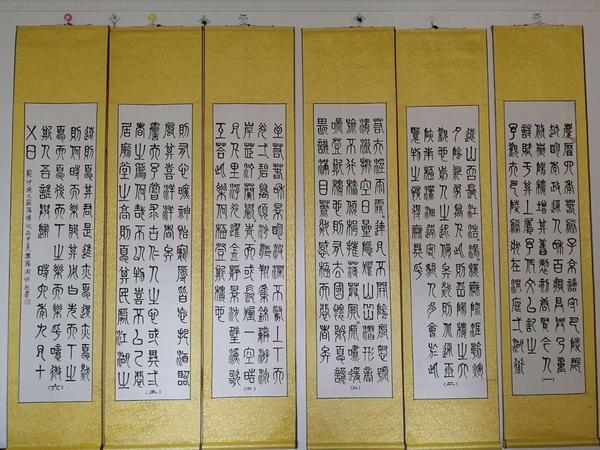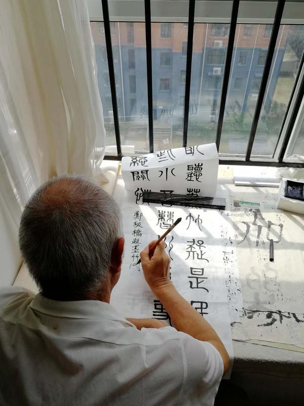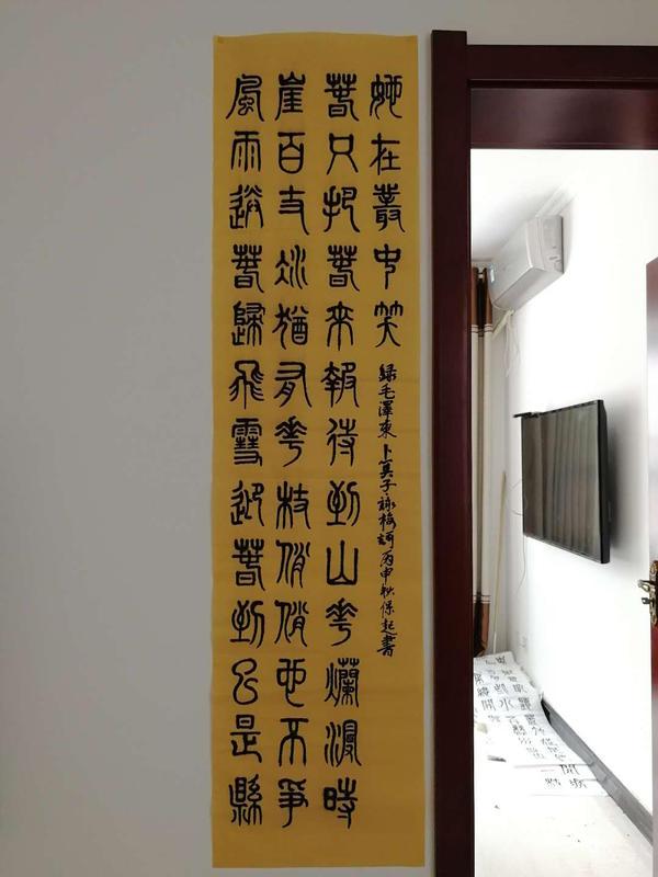 在周保起家中,客厅的墙上,房间门前,到处都贴着老人自己创作的字画作品。据老人讲,自己练的书法是篆书,最爱模仿清代书法家邓石如和杨沂孙的字迹。