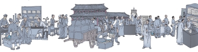 这幅“书店街正月淘书图”,是笔者数度踏访书店街查阅各种资料描摹而出。场景虚构,人事皆真。