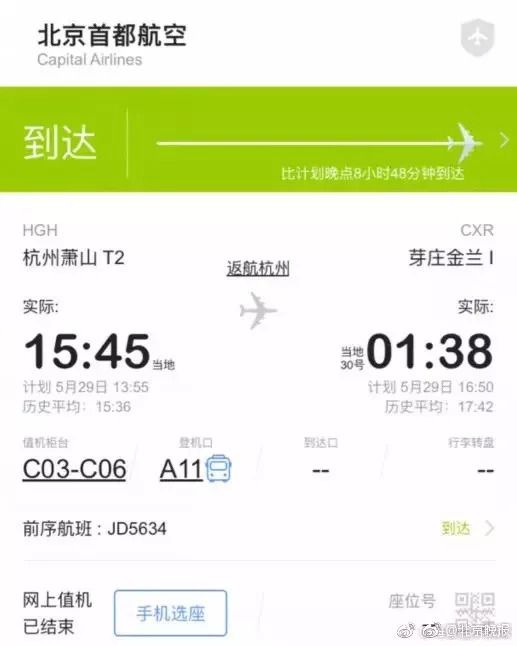 5月29日,首都航空的JD421航班是由杭州萧山国际机场飞往芽庄金兰国际机场,在起飞约1小时后返航。首都航空相关负责人称,返航原因系舷窗出现裂纹。