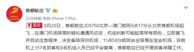 刚刚,首都航空JD5759北京—澳门航班8点17分从北京首都机场起飞,在澳门机场降落时疑似遭遇风切变,机组判断可能起落架有损伤,立即复飞并启动应急程序,决定备降深圳机场,11点58分航班安全降落在宝安机场,目前机上157名旅客和9名机组人员已经平安撤离,首都航空已经开展旅客保障工作。