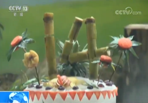中午11点多,保育员端出了两个生日冰蛋糕,上面用甘蔗摆出14的字样,还有熊猫爱吃的竹叶、胡萝卜、菠萝等。冰蛋糕里面也放了美食,不同的是,雌性熊猫圆圆的蛋糕上,有她和女儿圆仔的图样;而团团的蛋糕上,则用葡萄拼出了“台北”的“北”字,这是希望团团、圆圆能永远在台北动物园开开心心地生活。虽不是周末,但这个生日宴还是宾客满棚。