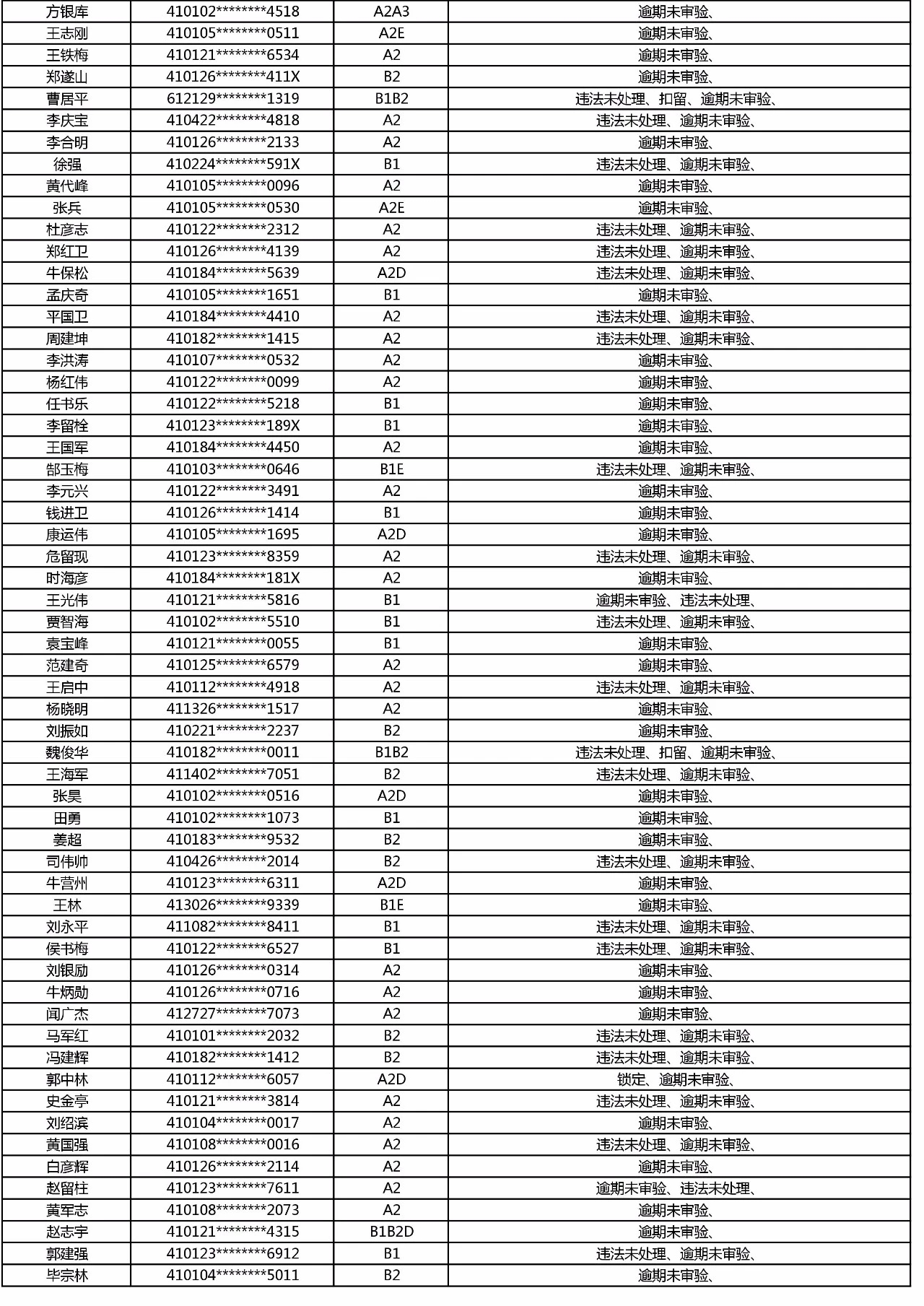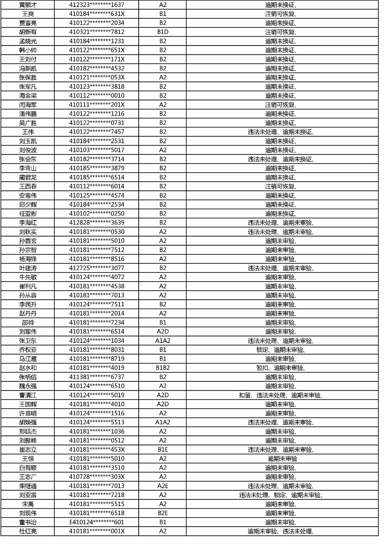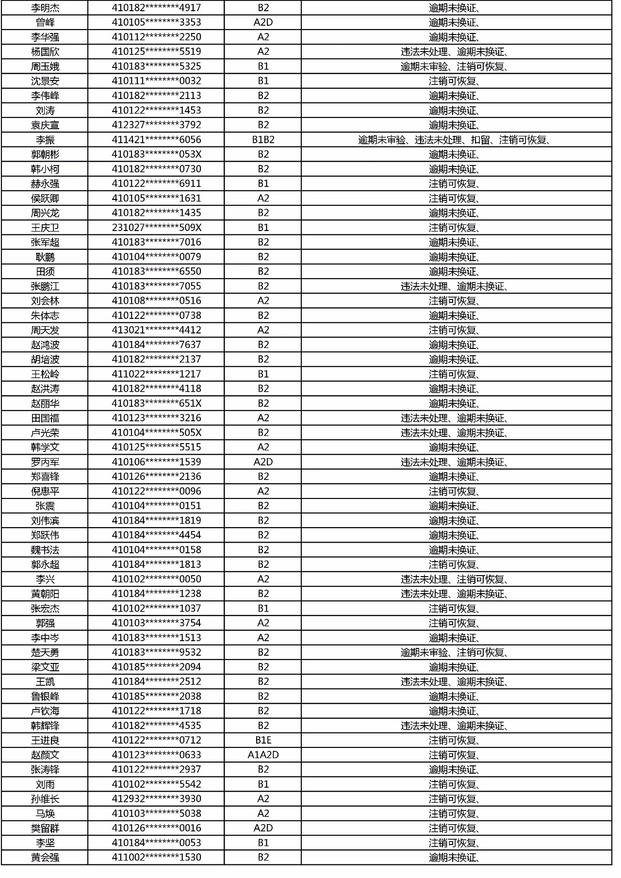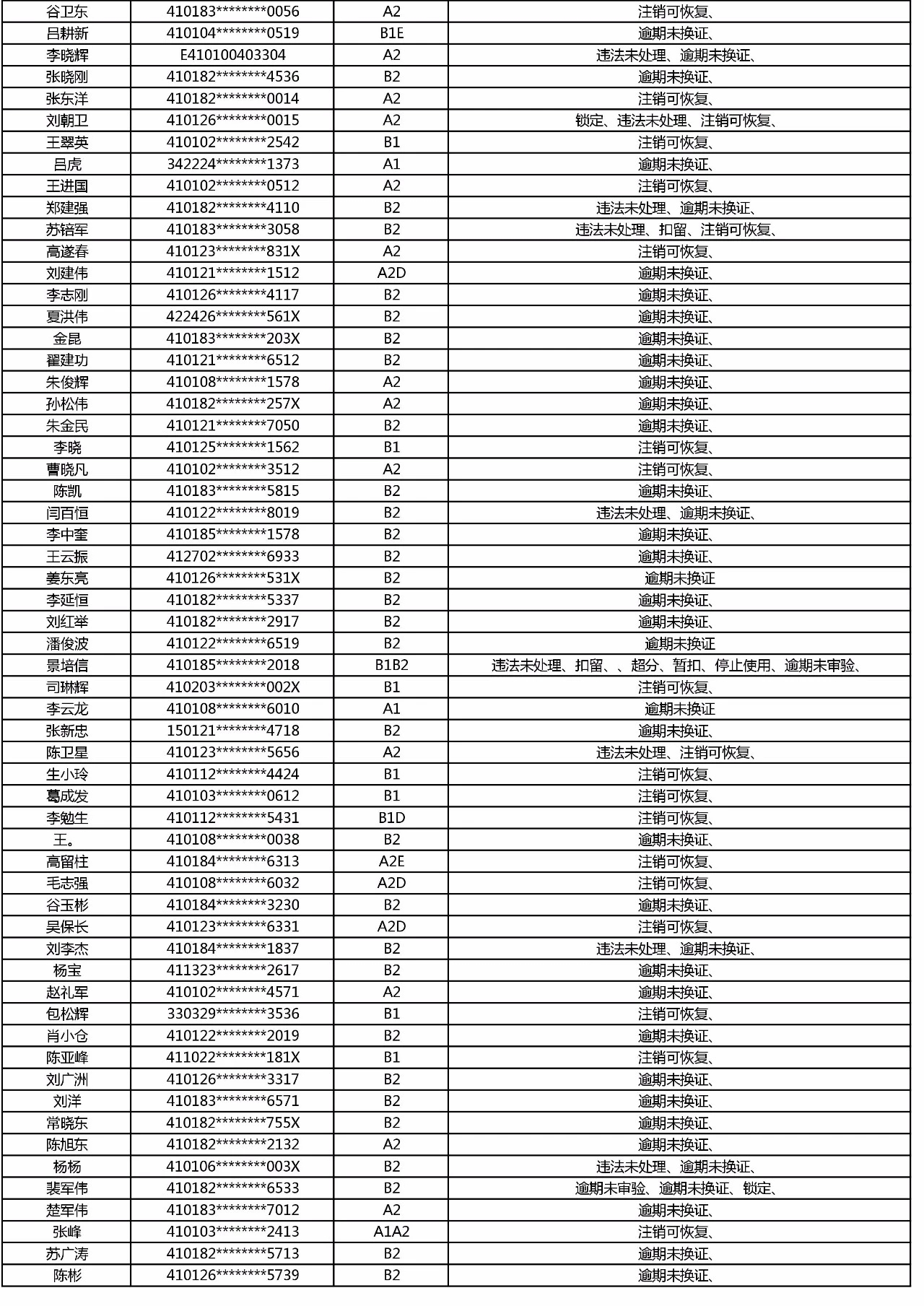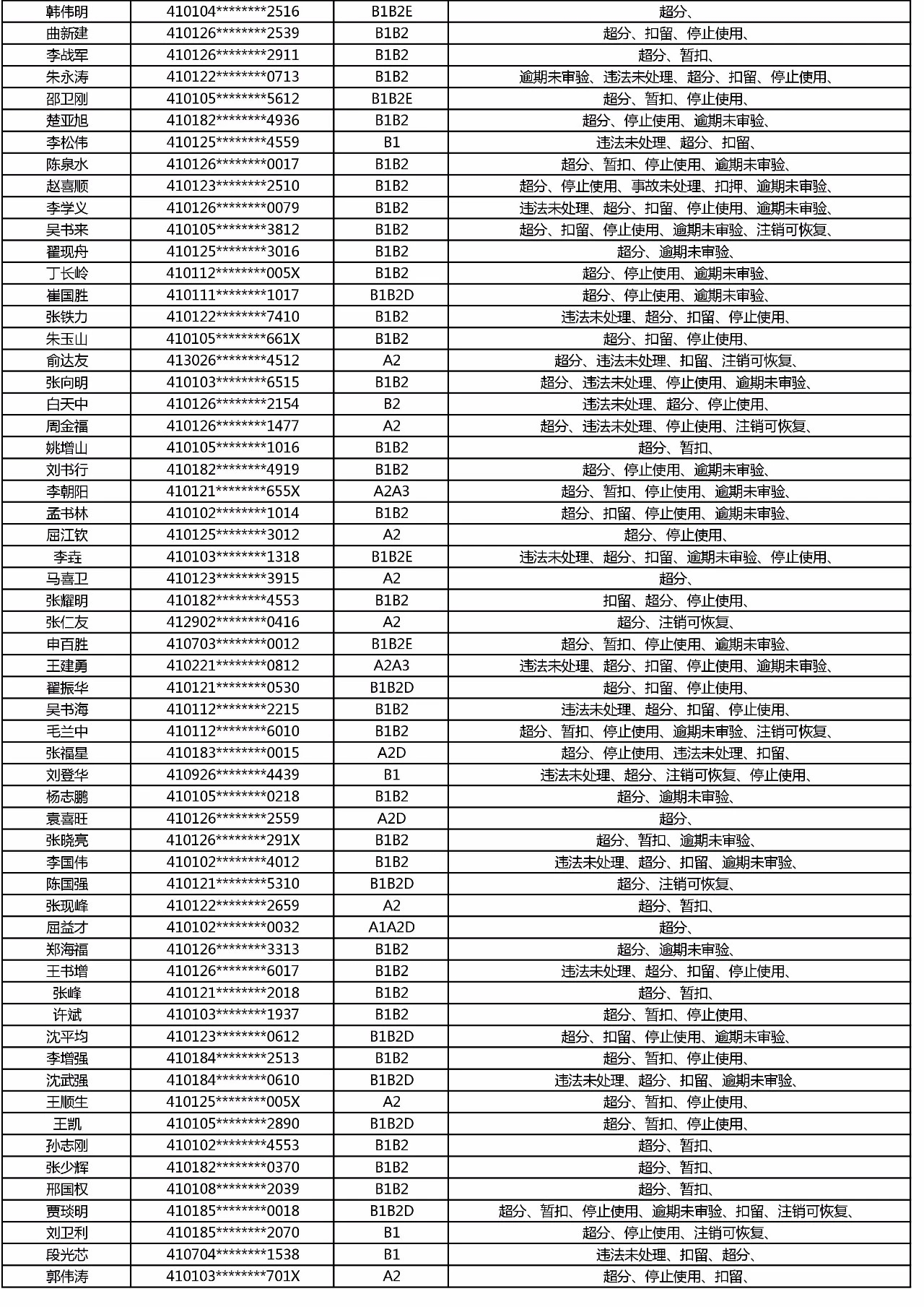 郑州市未换证已注销驾驶人名单(2018年8月31日公布数据):
