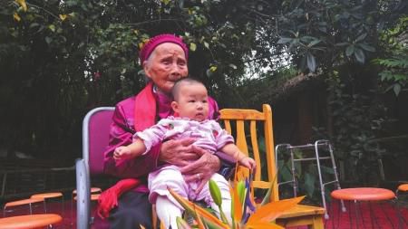 “ZEIZEI(注:意为奶奶,客家话喊法)”“祖祖”“高祖”“高高祖”……一声声呼唤,叫得朱郑氏笑容满面。今年3月,她的第六代后辈胡诗琪出生,这个小孩被朱郑氏亲切地称为“灰灰儿”。现场,胡诗琪被朱郑氏抱着坐在腿上,一老一幼,跨越百年,将亲情紧紧维系在一起。由于年纪太小,胡诗琪有点“害羞”,坐在老人腿上,一会儿呜呜哭闹,一会儿东张西望,一老一少其乐融融。 老人的孙女朱方琼告诉记者,胡诗琪是朱郑氏的第六代直系子孙。常人想都不敢想的六世同堂,在朱郑氏身上奇迹般地出现了。
