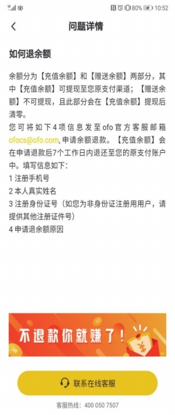 除此之外,贾先生发现账户余额的退款流程更加繁琐,需要用户将注册手机号、本人真实姓名、身份证号及退余额原因发送至指定邮箱,退款期需要7个工作日。有不少用户表示,在被APP“诱导”成功充值后,因退款程序繁琐而放弃,ofo的客服也联系不到,只显示“当前咨询人数较多”。