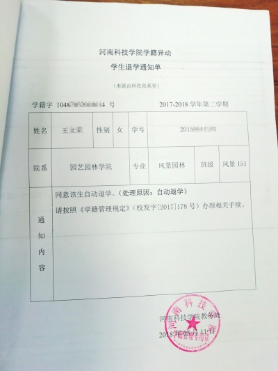 这名女孩儿小荣(化名),原本是河南科技学院园艺园林学院风景园林某班的大三学生,试图重返校园的她,面临的却是一个尴尬局面——校方相关人士回应称,其学籍已注销,回归学校已基本无望。