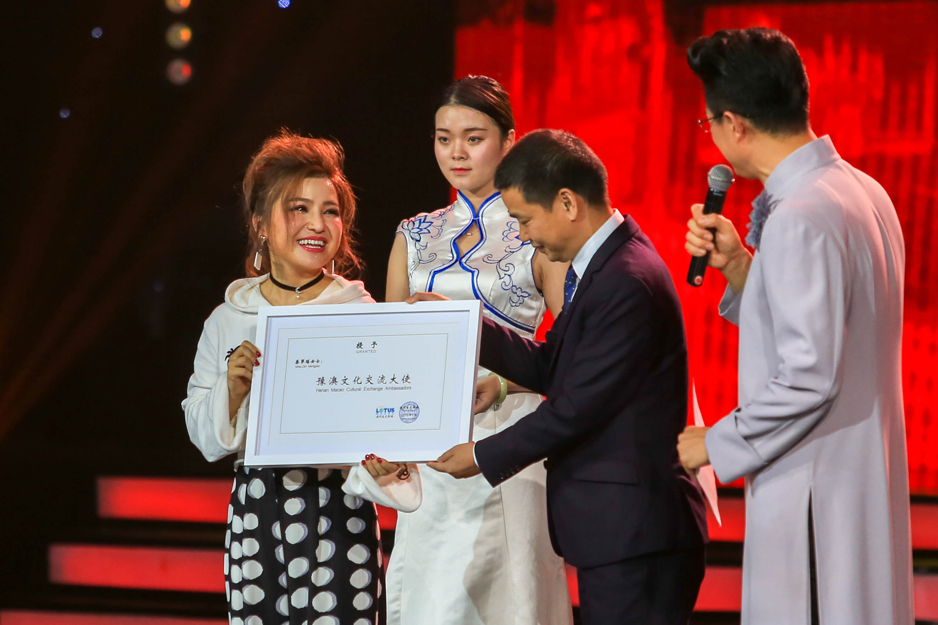 澳门莲花卫视台长李自松代表莲花卫视向秦梦瑶颁发了“豫澳文化交流大使”证书。