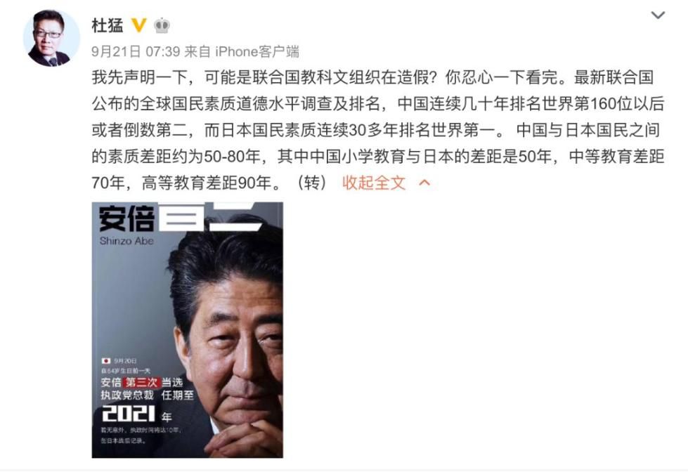 9月21日一大早,一位微博大V就开始了一天抹黑中国的繁忙工作,一位名叫杜猛的微博签约自媒体大V发帖称: