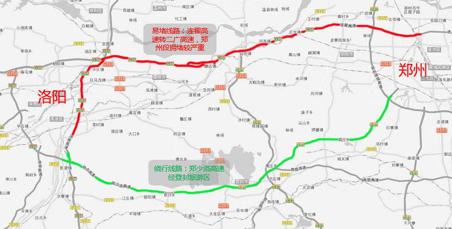 绕行路线:从西南绕城高速郑州西南站走郑少洛高速,经登封向西,到达伊川北等收费站或转二广高速(G55)向北。