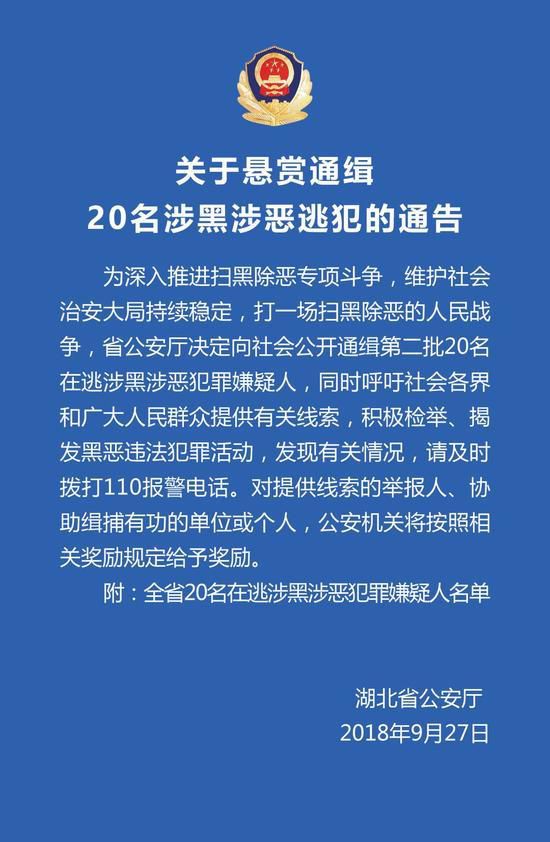 中新网9月28日电 据湖北省公安厅微信公众号消息,湖北省公安厅向社会公开通缉第二批20名在逃涉黑涉恶犯罪嫌疑人,呼吁大家提供有关线索,积极检举、揭发黑恶违法犯罪活动。对提供线索的举报人、协助缉捕有功的单位或个人,按照相关奖励规定给予奖励。
